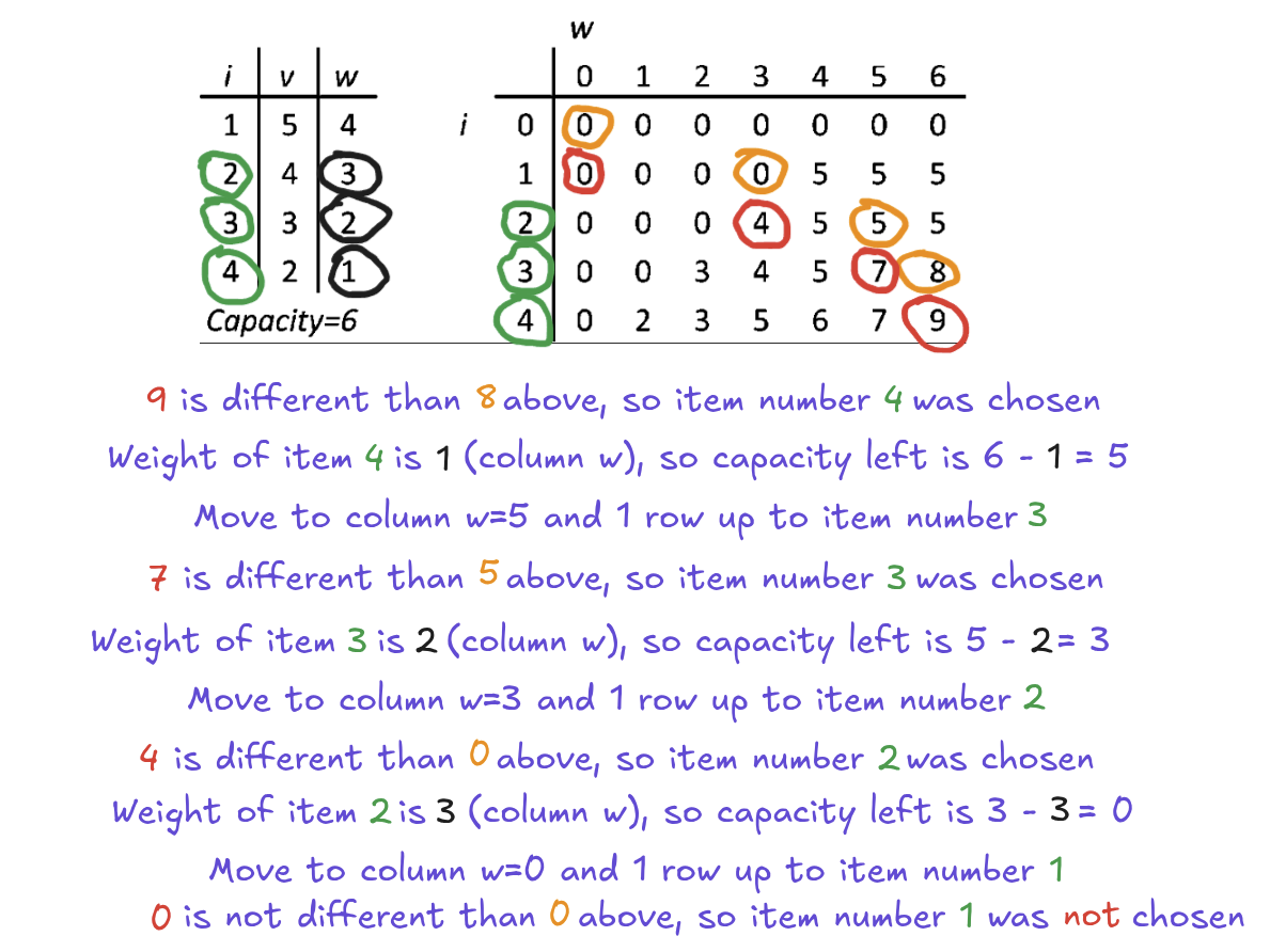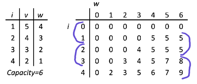 On the left, there is a list of 4 items. i is an index, v is a value and w is a weight. Units irrelevant. Capacity is 6. That's why on the right side there are 6 columns (each column is a part of total capacity) and 4 rows (one per item). Ok, actually there are 7 and 5, because of padding with zeros, but that's only for a computation convenience (every row and column has a parent, index arithmetic gets much easier). You could actually do it without padding, but I tried and fallbacked to padding anyways, because index arithmetic was a bit annoying. The table on the right is called a DP table. It's where the computation happens.