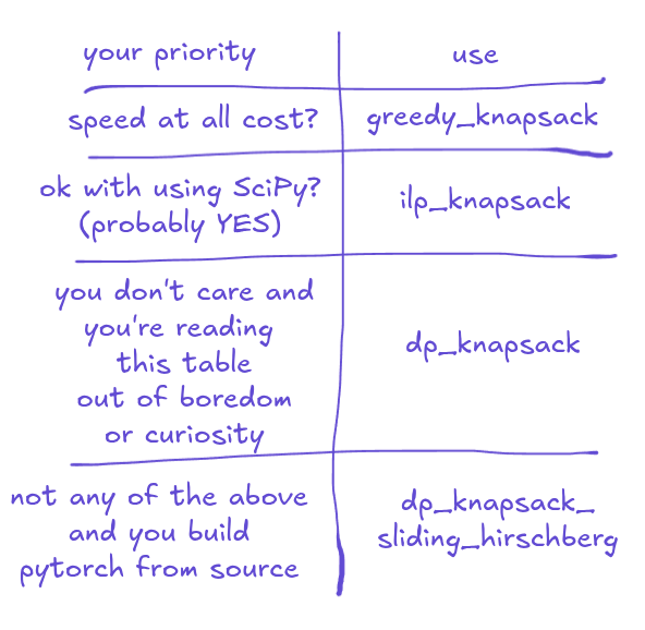 No. Look - with these two optimizations combined, we can decrease the DP table size from shape=(number of items, max weight) to shape=(2, max weight), effectively reducing a peak memory by a factor of 20x - on my machine with 64GB RAM dp_knapsack crashes on problems with 100 items, while dp_knapsack_sliding_hirschberg is able to handle problems with 2000 items within this RAM budget. We also gain some runtime speedup, roughly 37%, but I didn't measure it very rigorously, though. That being said - if you don't mind using SciPy, then you probably should use ilp_knapsack instead. It's MUCH faster than any existing DP knapsack implementation in PyTorch. It's a bit slower than a greedy algorithm, but still very fast, yet unlike greedy and similarly to both DP solvers, it provides an exact solution.